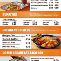 3 Bacon and Egg 3 Potato and Egg 3 Chorizo and Egg and 3 Bean and Cheese. 2 eggs 3 strips of bacon refried beans 2 freshly made tortillas and homemade ranchero sauce. Taco Bell1113 E Colorado St.